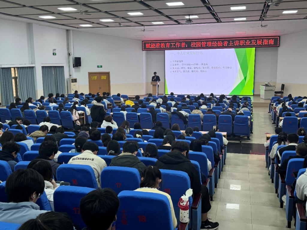 2025年11月5日,tyc7111cc太阳成集团“企业专家进校园”系列主题就业讲座在学校报告厅成功举办。本次讲座特邀临榆中学校长赵东华担任主讲嘉宾,以“赋能准教育工作者:校园管理经验者主讲职业发展指南”为主题,面向学院大二、大三师范生开展就业指导,300余名学生到场聆听。