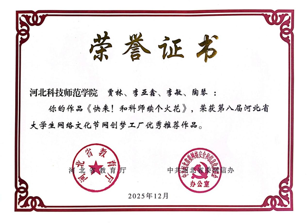近日,由河北省教育厅、中共河北省委网信办联合举办的第八届河北省大学生网络文化节评选结果正式揭晓。我院选送的作品《快来!和科师续个火花》在“网创梦工厂”赛道中表现优异,成功获评省级优秀推荐作品。